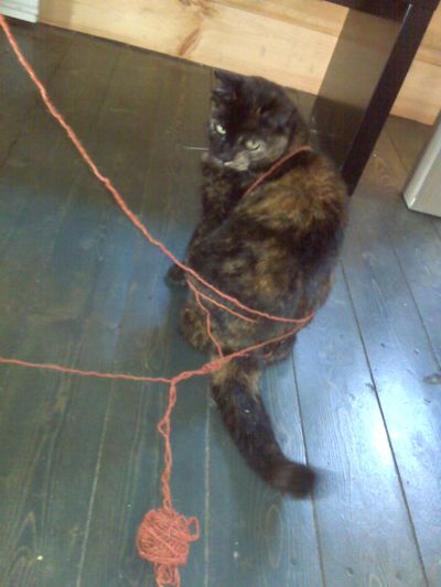 3. My Lola has also found herself this way a couple of times but her favorite is to grab the ball in her mouth and walk all over the apartment. I love seeing the tangles yarn around table and chair legs. Now, I keep the yarn out of her way.