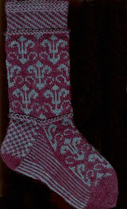 This two-color sock pattern is full of fun details. A floral design is contrasted with checkerboard patterning and Latvian braids, ensuring that you’ll never have a boring moment while working on these socks!
