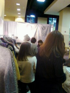 Norah and I just returned from a fun and busy weekend at Vogue Knitting Live in New York City. We had a wonderful time meeting enthusiastic knitters and sharing our Fall 2011 and Spring 2012 designs with them. In addition to a great Berroco fashion show on Saturday, Norah gave design retrospective lectures to a packed audience and did book signings at various booths on the marketplace floor. I spent most of the show at our fitting booth, fit.knit.sit. We had small and large-sized sweaters available to try on from both of our fall and spring pattern collections, and it was a great opportunity to help people plan their next projects. Here are a couple of quick photos I took in between fittings at the booth: