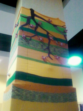 Fiber artist Suzanne Tidwell knitted giant striped covers for the columns on the show floor – Berroco donated some of the yarns she used. My photo doesn’t do it justice, but at least you can see how huge those columns were!