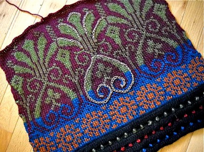 “As I went I decided I wanted to do as many different stranded patterns as I could and my color scheme became much more random than I had originally envisioned. My husband says there were knitting books strewn in every room of the house with slips of paper, strands of yarn, and spare needles sticking out all over as I marked my place for things that were interesting. Random bits from all sorts of things I’d admired. I picked the next motif only after I finished one. It got harder to try to find new ones from different places as I went along but that was part of the fun. My queue got a lot longer too as I kept coming across yet another pattern I’d love to knit….