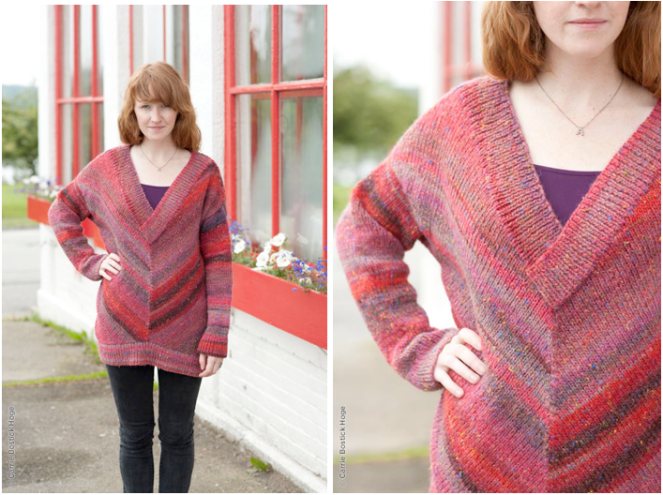 It’s worked in Lodge, Berroco’s new self-striping wool blend, which is perfect for accentuating the bias-knit panels that make up the body of the sweater. A deep V-neck and drop shoulders add to the cool, slouchy silhouette.