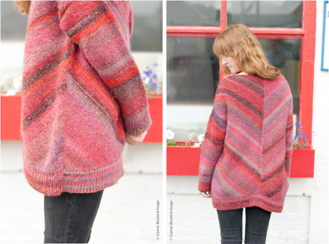 I *love* working in different directions with striping yarn! It is, indeed, designed to be worn with 6″-10″ of ease and this model is wearing the 44″ sweater. Fashion, in general, is moving towards this oversized look, but as the knitter of your own destiny, you can choose the amount of ease that would suit you!