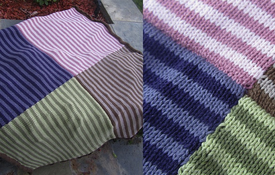 The “Blanket for Baby Cadwell” designed by Jennifer Mattesky was inspired by the “Circle & Stripes Stroller Blanket” by Susan B. Anderson. Jennifer used Berroco Weekend, which she said is perfect for the Southern California climate. It’s also soft & machine washable and it comes in a variety of colors. I love the shades she chose for striping – fun but still soothing!