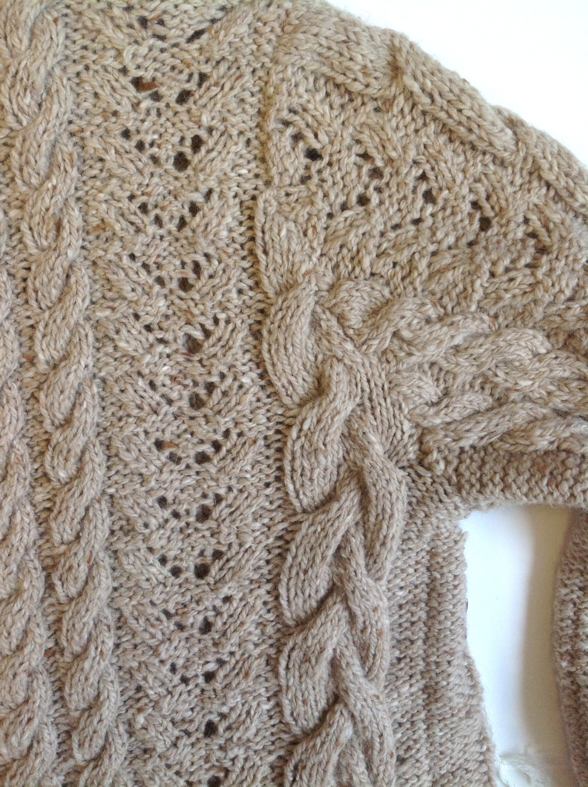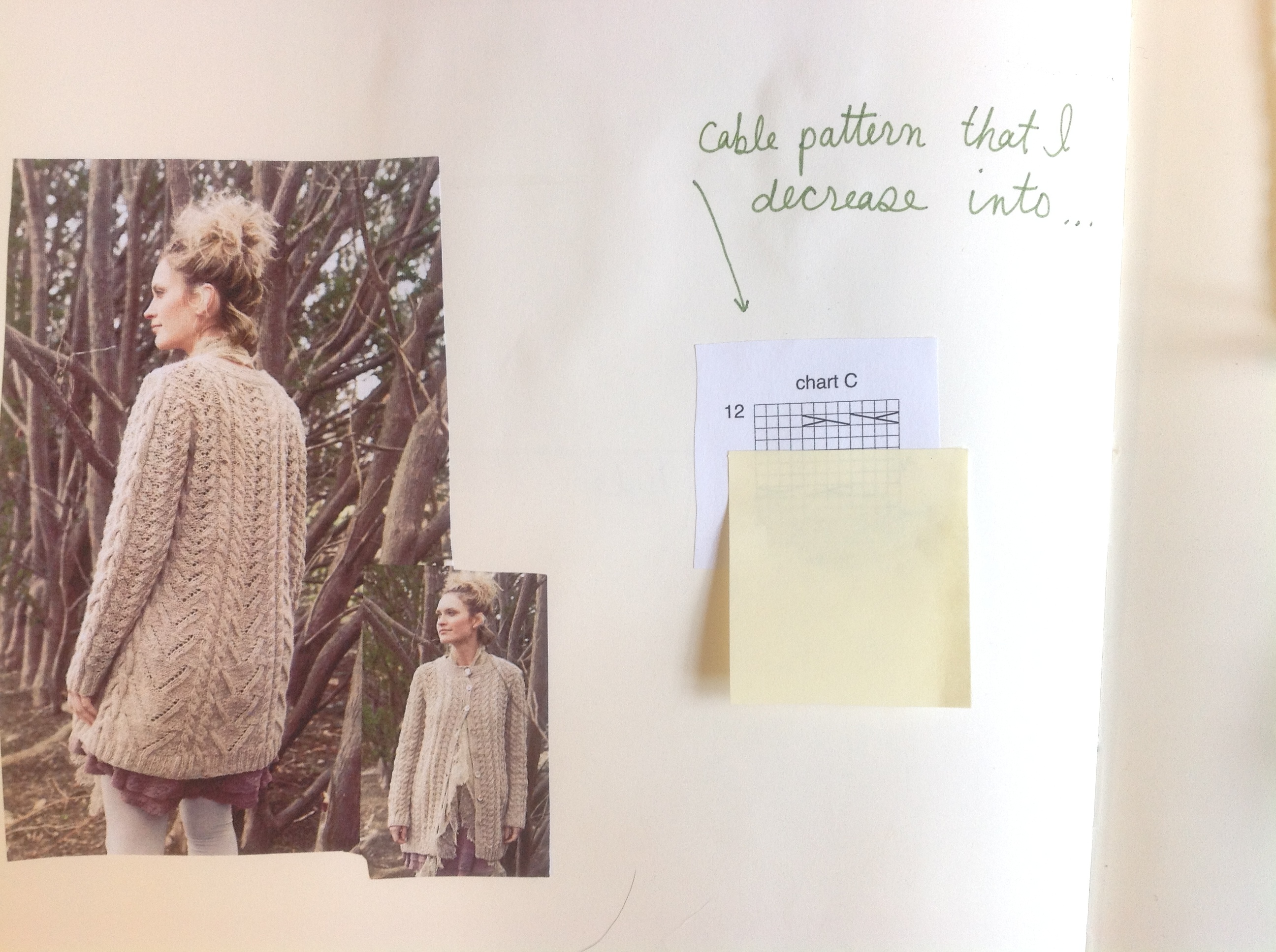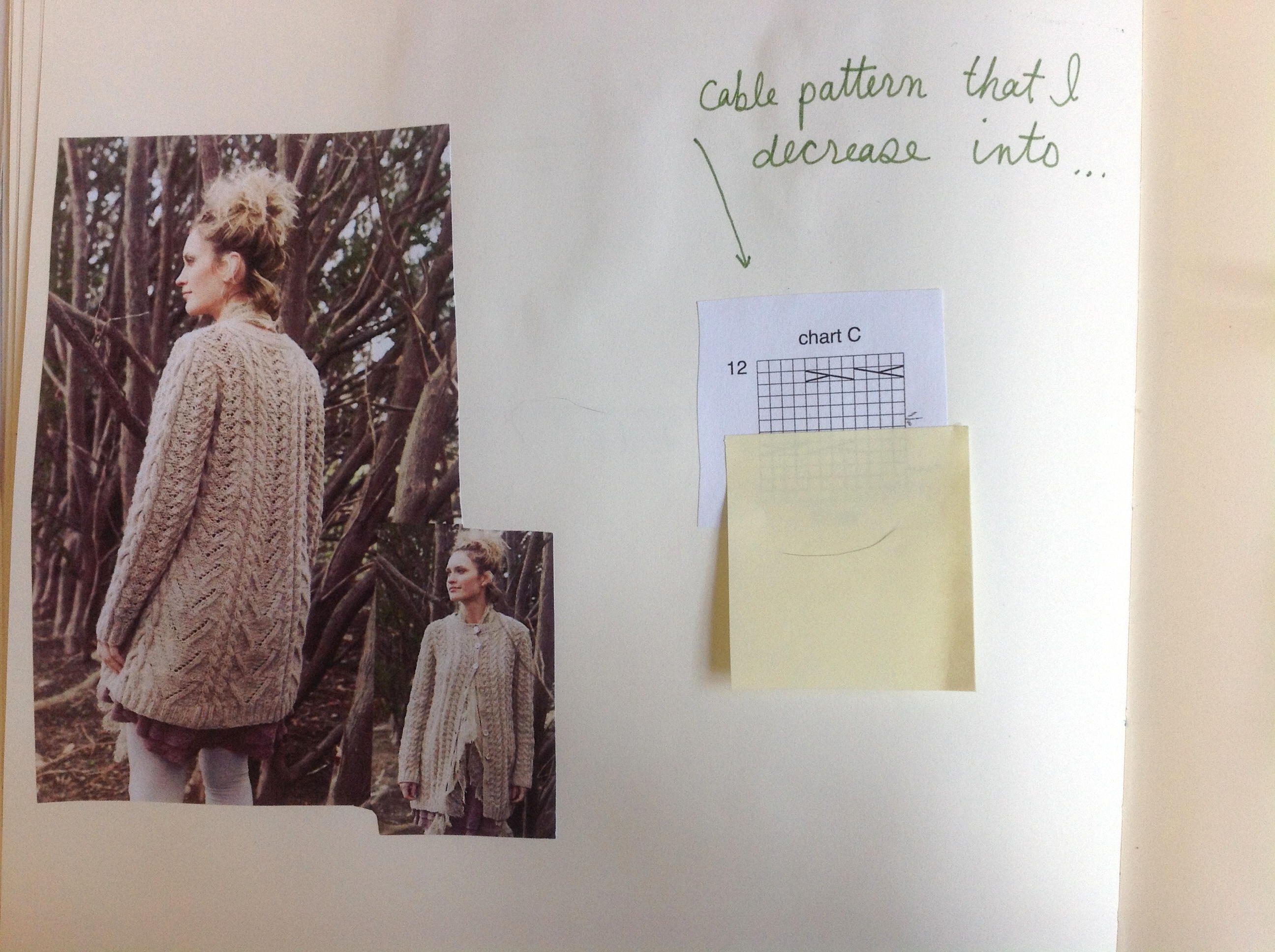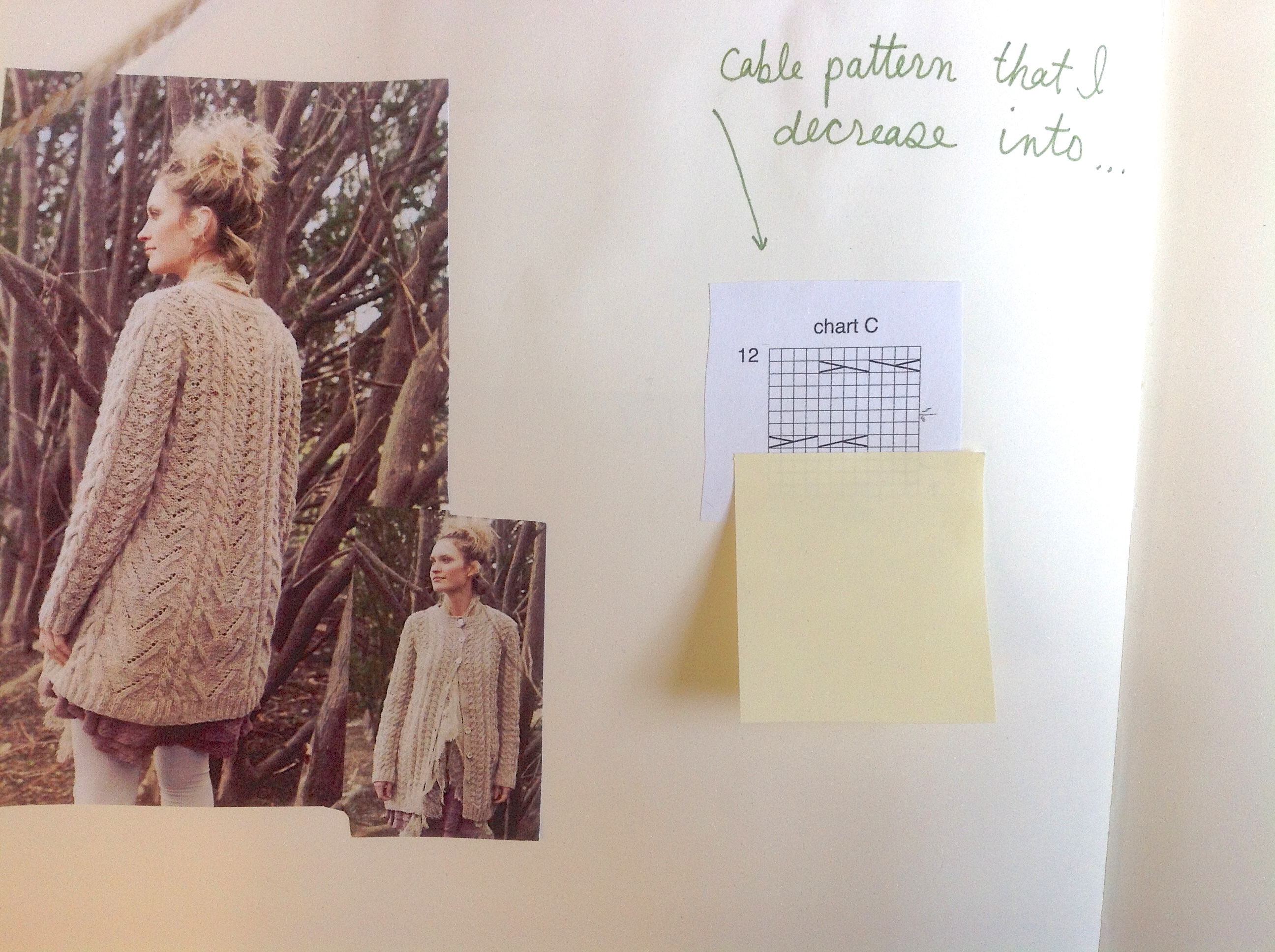 I’ve demonstrated a few instances of decreasing in pattern and I thought I was finally starting to get it. But as I approached the armhole decrease in Fleta (the latest project on my needles) I realized I was totally in over my head. Decreasing into a cable can be confusing. Lucky for me, we have a sample of the sweater in the office and my desk is conveniently located right next to the designer!