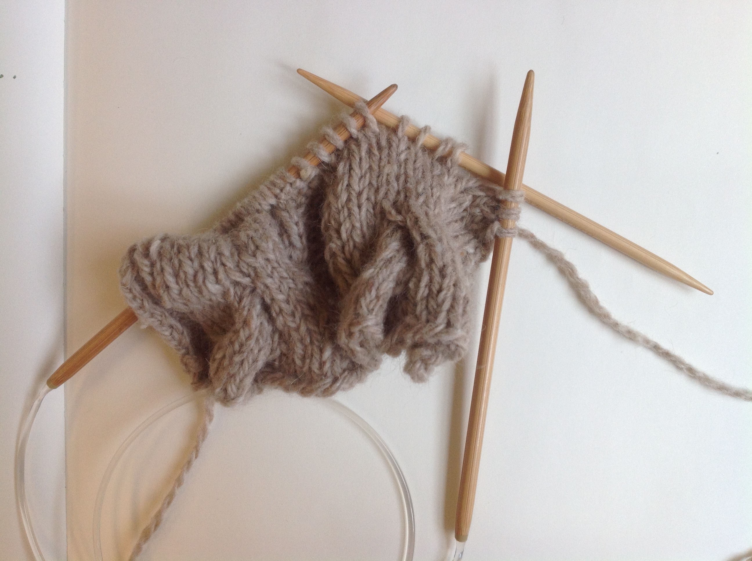 The lesson that I have taken from this pattern decreasing is to really look at your knitting. Let your knitting tell you what needs to be done. What looks good? Is my pattern symmetrical? How can I make my decrease in pattern symmetrical? To the best of my ability, I needed to continue cabling my large cable and decreasing into the side. I continued to do that until there were only 7 stitches left in my cables. Then I just continued to decrease and not cable until the cable was gone.