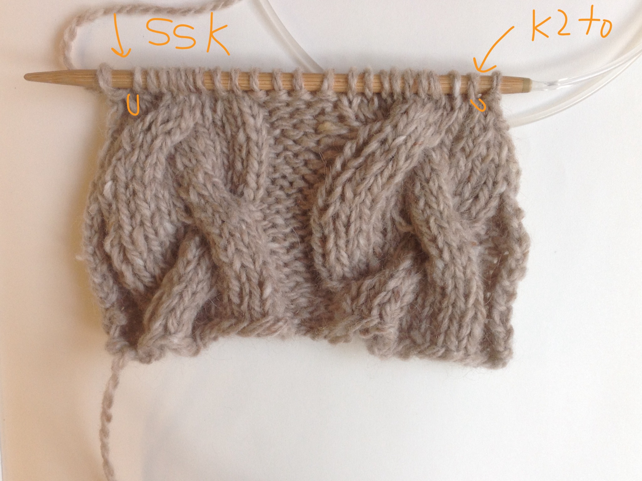 The instructions call for p1, p2tog every right side row. This was super simple as the fabric along the sides of my back were reverse stockinette up until it reached a cable…