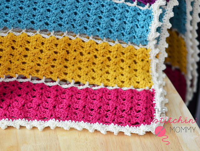 When I was making this afghan, I ran out of yarn twice, and in the middle of a colored row. I ended up with two different dye lots of the Sakura (pink) yarn and didn’t know what to do since joining them would make the afghan look weird. That is why there is a stripe of pink in the middle and at the two ends.