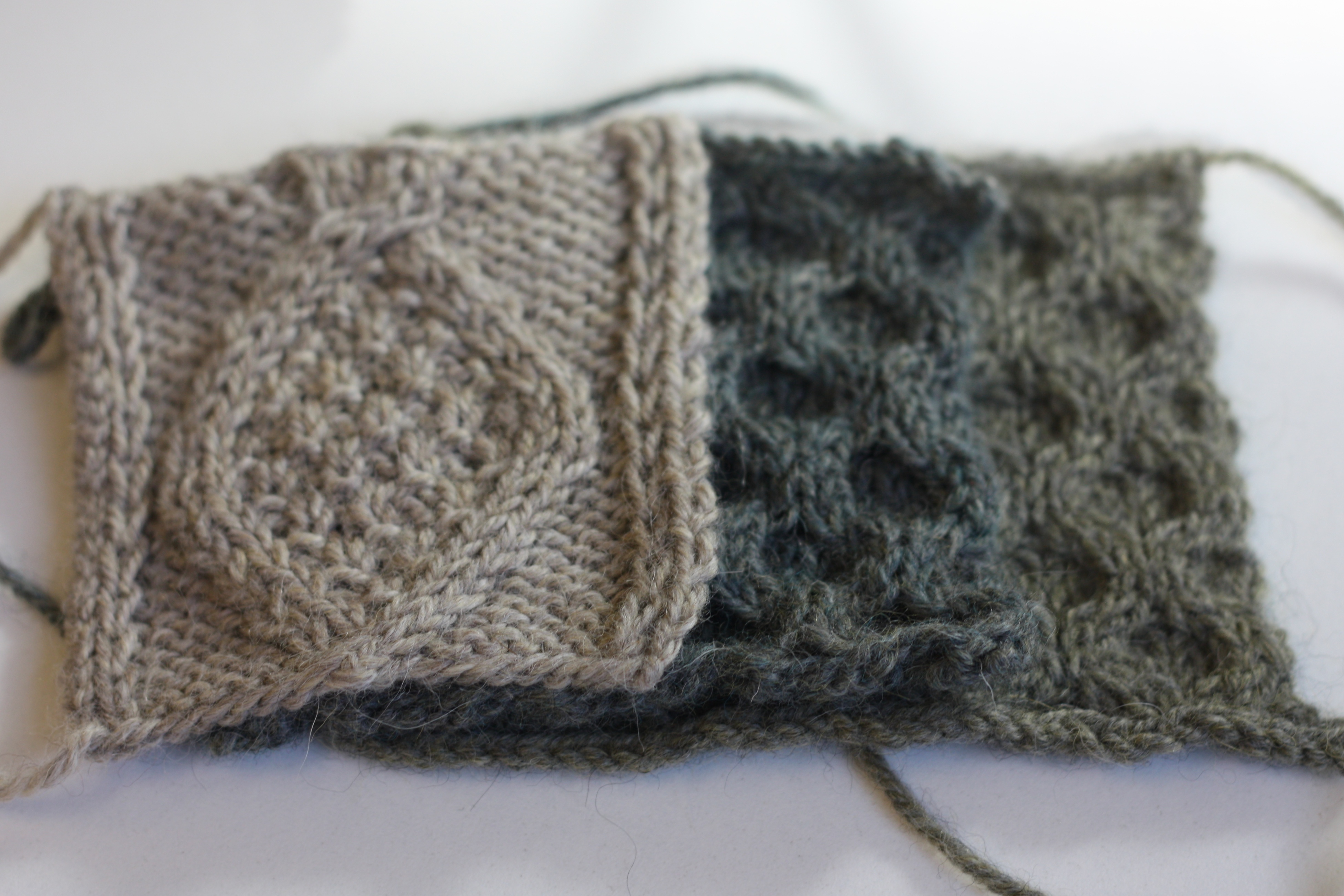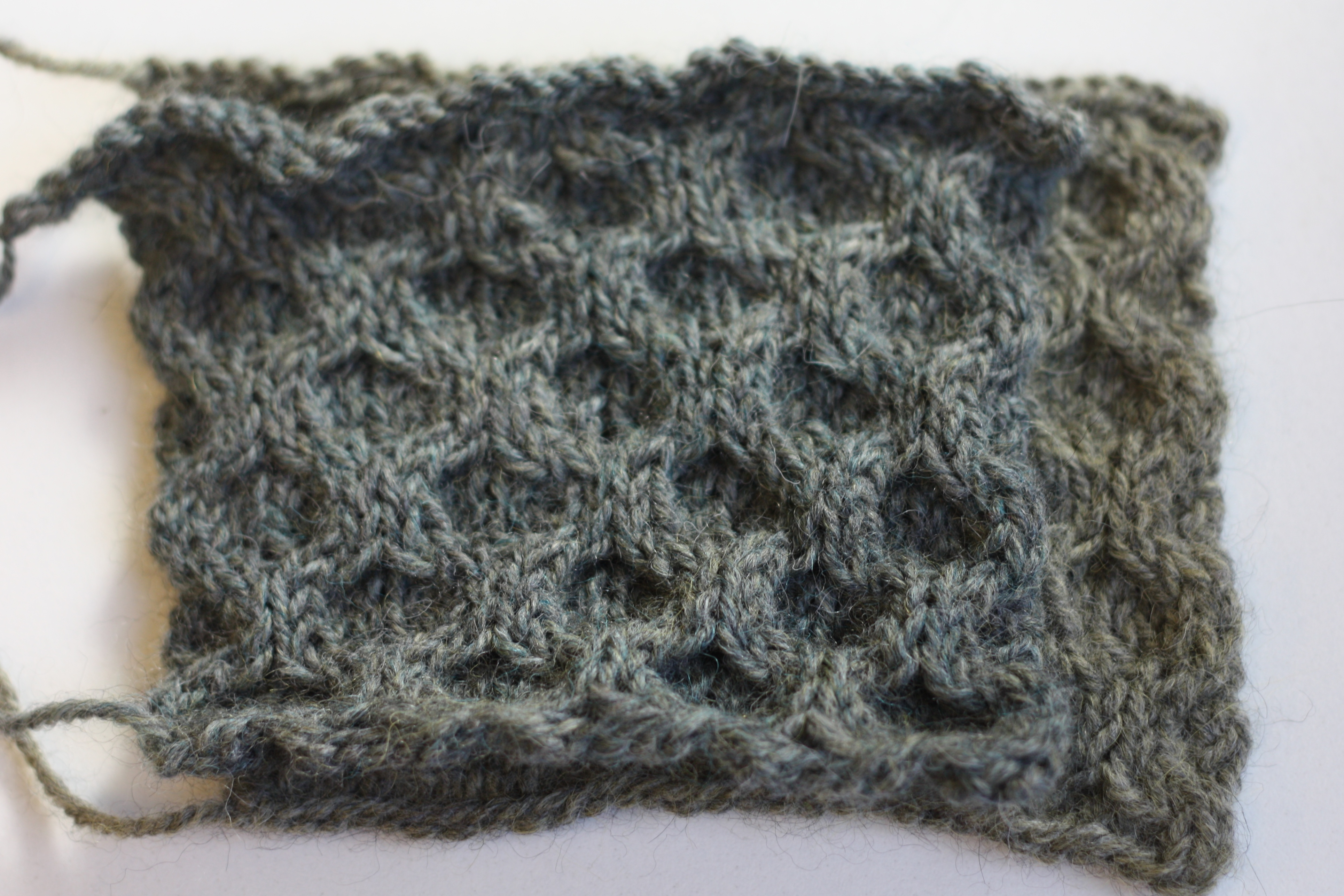 Because my pattern offers gauge measurements for 2 different patterns, I knit both. For my second stitch pattern, the measurement was 13 stitches in diamond cable = 2 1/2 inches. I included the surrounding pattern stitches in my swatch but worked only 1 repeat since the row gauge wasn’t given.
