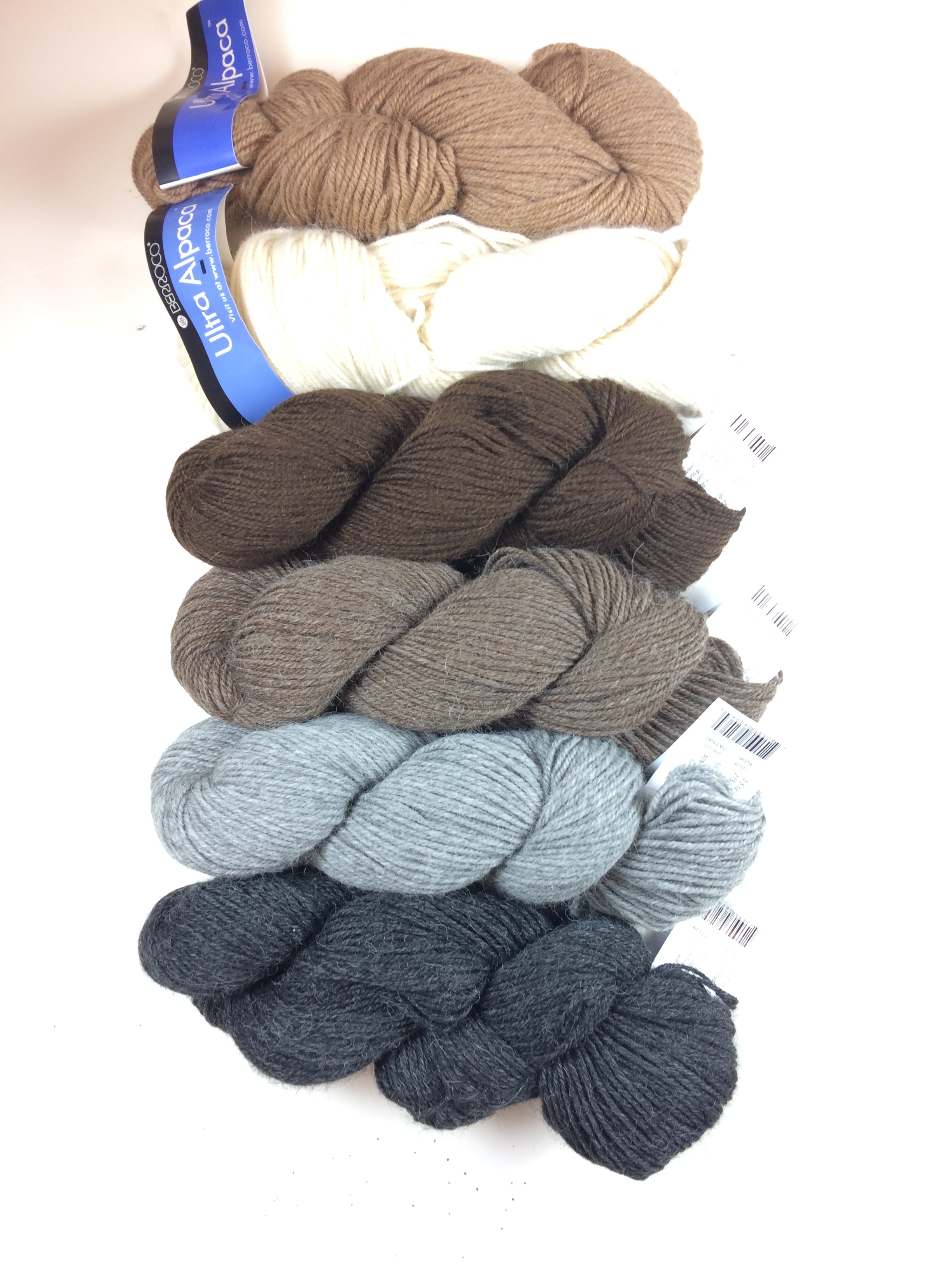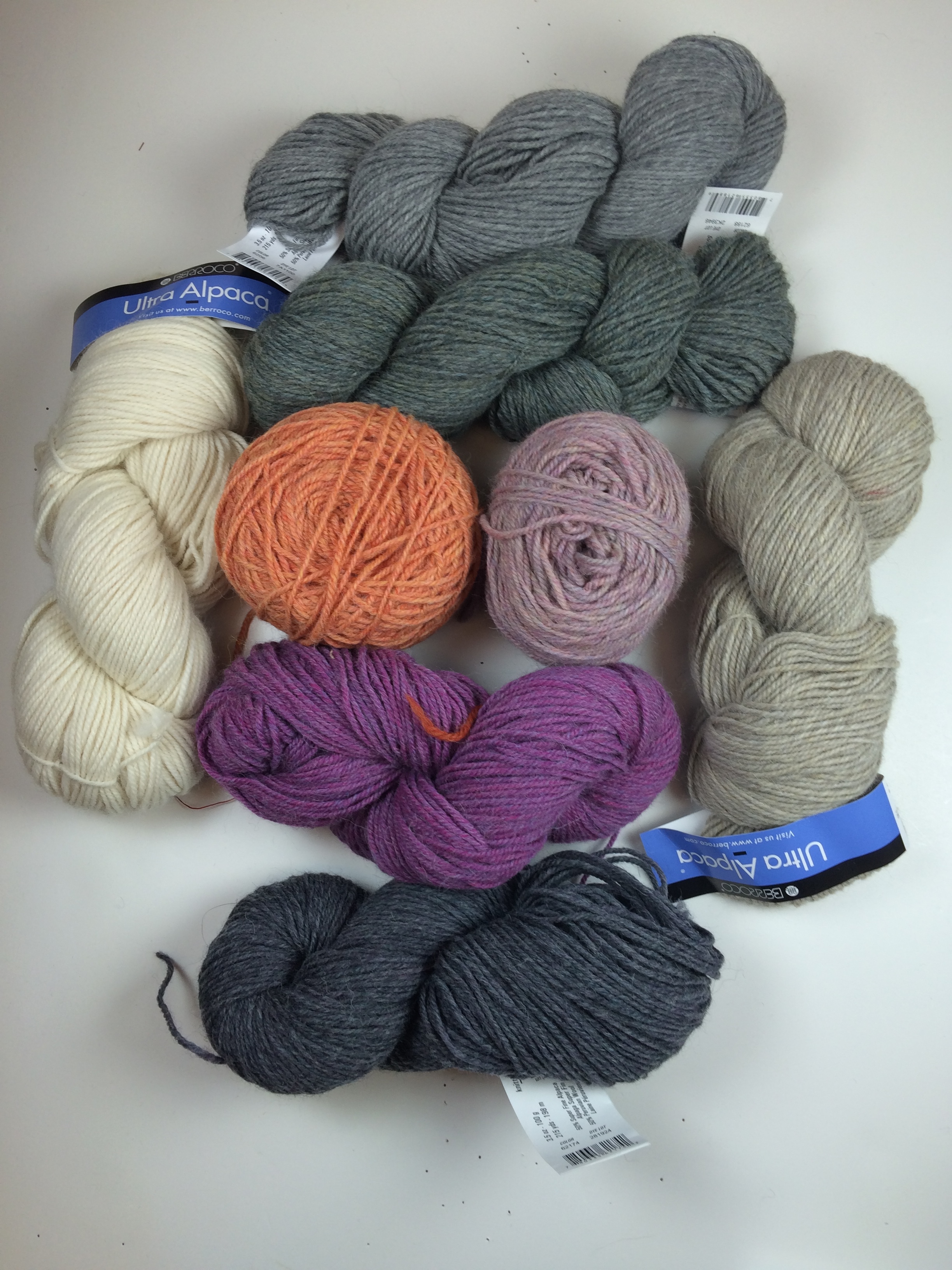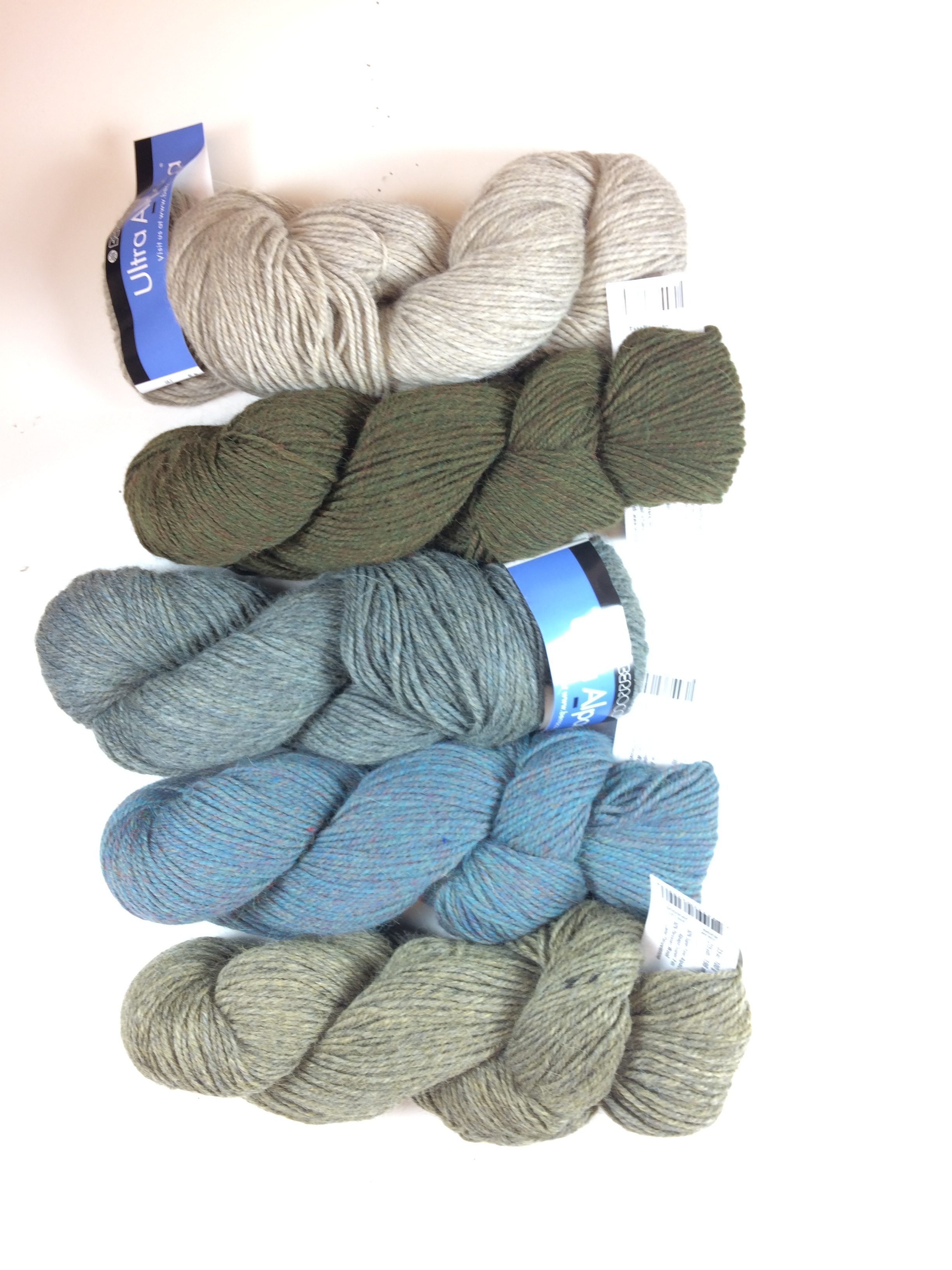 Here are some Berroco Ultra Alpaca colors in a range of soft neutrals and misty blues (shades: 6299, 62170, 62188, 62173 in the top image, shades: 6289, 6206, 6204, 6205, 6201, 6202) in the bottom image):