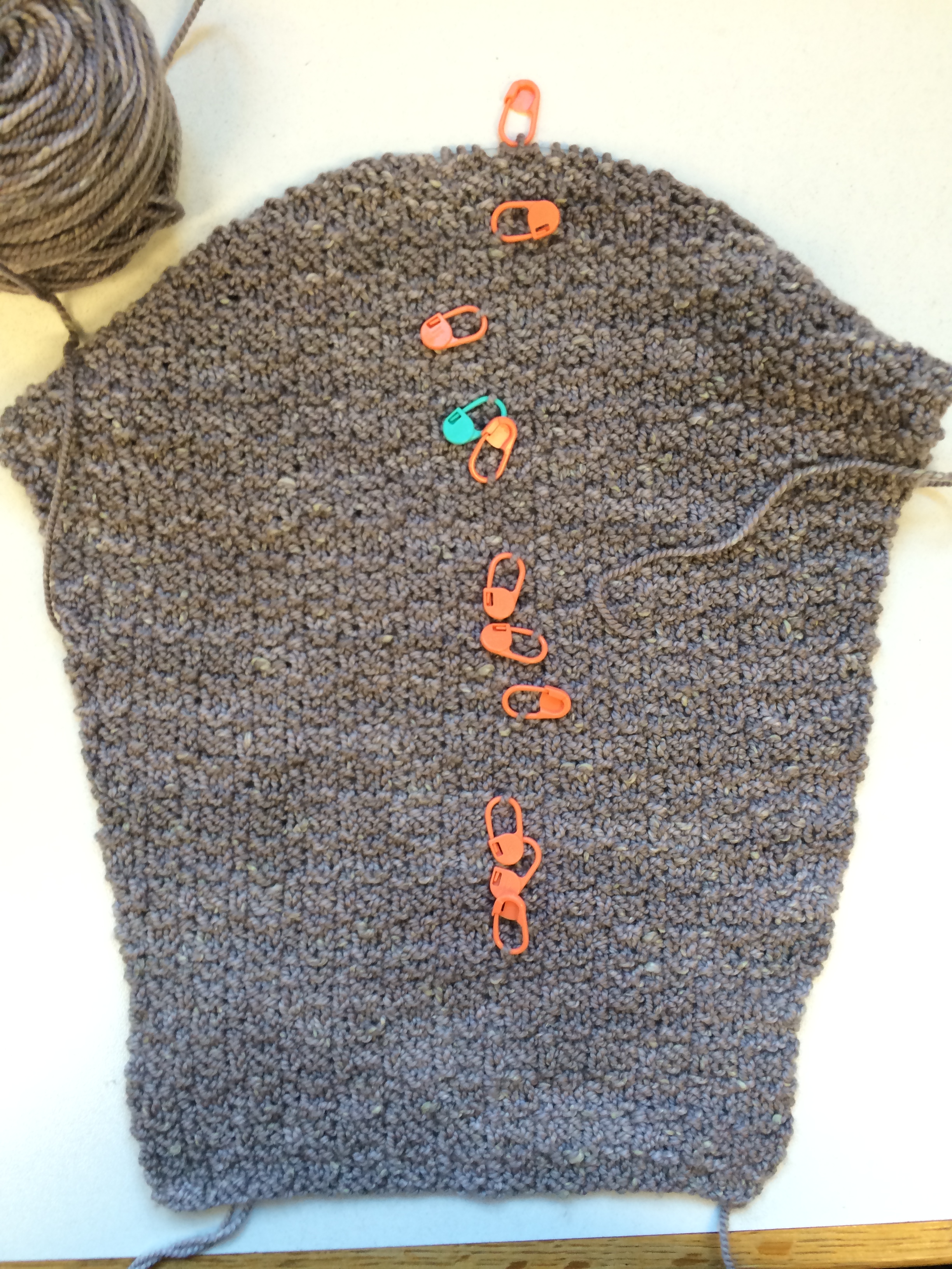 I am a bit behind the other girls in the office, just on my first sleeve. I love the way Berroco Artisan feels as I knit the textured stitch pattern with it. However, when I am working on a project like this, I tend to get confused with how many increases or decreases I have done as I work. I don’t want to make any mistakes to slow me down! So I have been placing a marker on a stitch from every increase row. This way I can count my stitch markers instead of having to understand my very textured fabric to keep track of where I am in my project! I think this is one of my new favorite tricks.