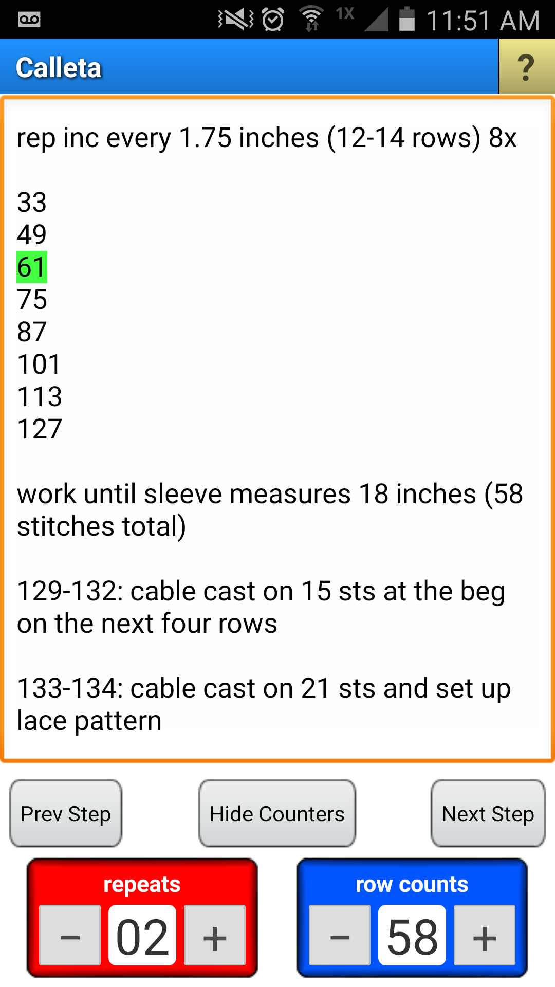 I was telling Ashley how much I loved my stitch markers when knitting Calleta and she shared an app with me that she uses to keep track of her knitting. It is called Visual Knitting Counter and it sounds so cool! It allows you to enter notes and has two counters, which Ashley uses to keep track of rows/repeats.