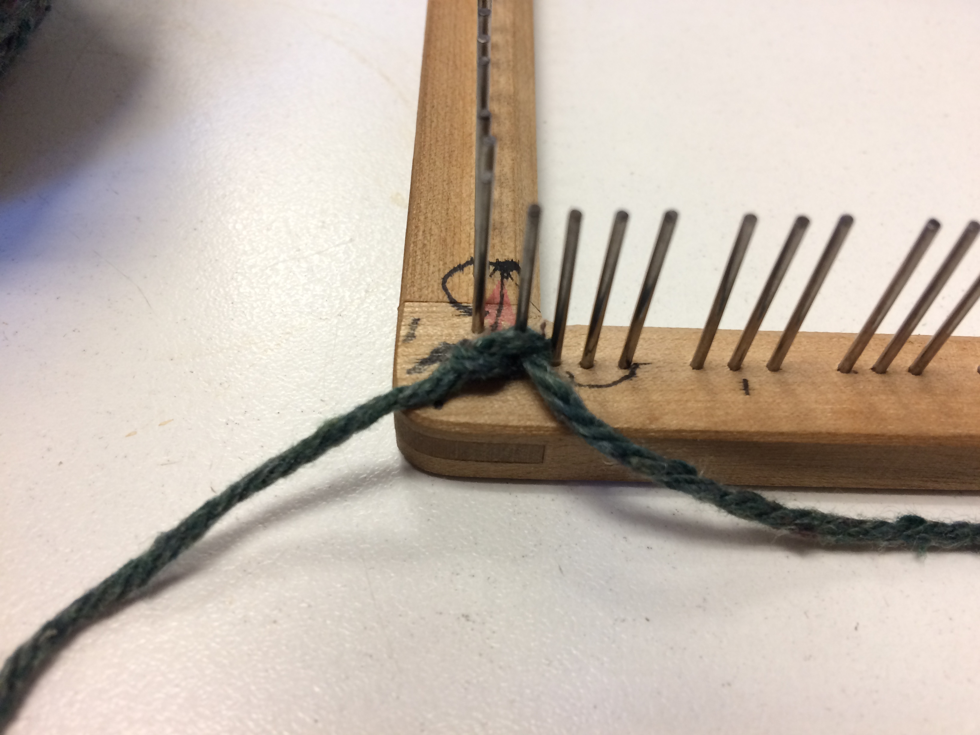 To start, anchor the yarn on the bottom left corner of the loom. I tied a slip knot and anchored it to the first pin on my loom so that it is easy to unravel the knot when I’m ready to weave in the ends.