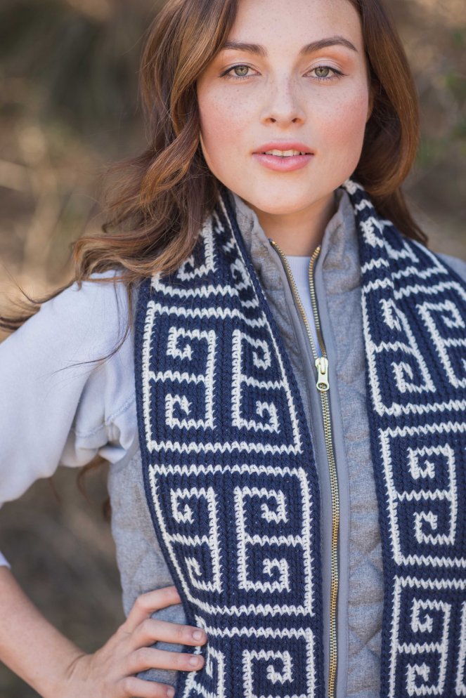 The Crossroads Scarf uses a diamond motif to create a classic crocheted scarf.