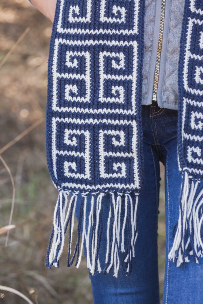 This is the Route Maps scarf, which uses a Greek key motif in a self-fringing scarf.