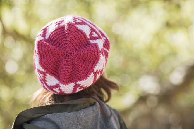 This is the Passenger Slouch, with three different motifs worked around the body of this slouchy hat.