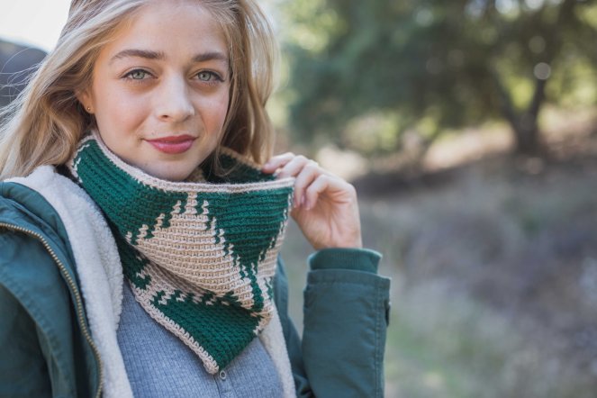 The Evergreen Country cowl uses a wide motif to create a boldly patterned cowl, crocheted in the round.