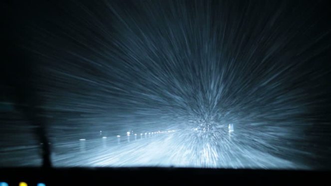 This drawing reminded me of the whiteout conditions that I often had to drive through on the main highway in my home province of Manitoba. When it is pitch black outside, snow isn’t white until it is picked up by the headlights of your car. I wondered whether I could use my gray color palette to show what a blizzard looks like when driving on an endless stretch of blacktop at night.