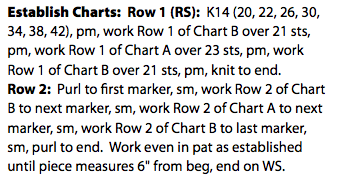 Row 1 had you start the two charts, referring to Row 1 of both Chart A and Chart B. Row 2 has you working the wrong side, purling to your chart markers, then working Row 2 of each chart, then purling some more. After that, it says “Work even in pat (pattern) as established.” This means that you’ll continue working the sides of the sweater in stockinette stitch (knit on the right side, purl on the wrong side), then work the chart rows in their order. So on Row 3, you’ll work Row 3 of each chart, and on and on. The tricky part here is that Chart B has 8 rows and Chart A has 10 rows. So when you get to row 9 (which would be a right-side row), you’ll knit to your first marker, then work Row 1 of Chart B, work Row 9 of Chart A, then work Row 1 of Chart B again. We’ll have another blog post about managing charts with different row counts, but until then, this blog post may help you keep track of your rows.