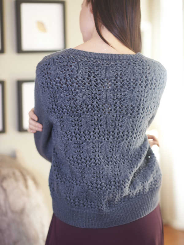 Emmi is a cozy cardigan featuring a all over lace repeat pattern, with front v-neck shaping and blousy stockinette stitch sleeves.
