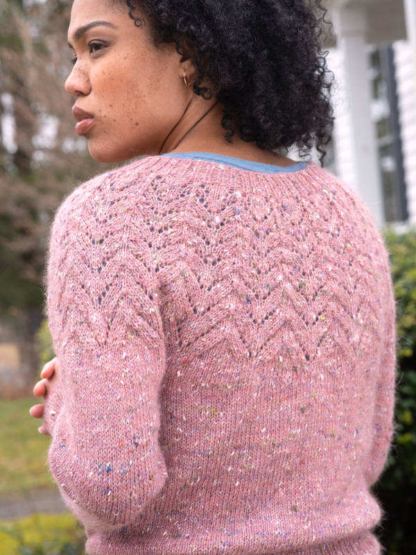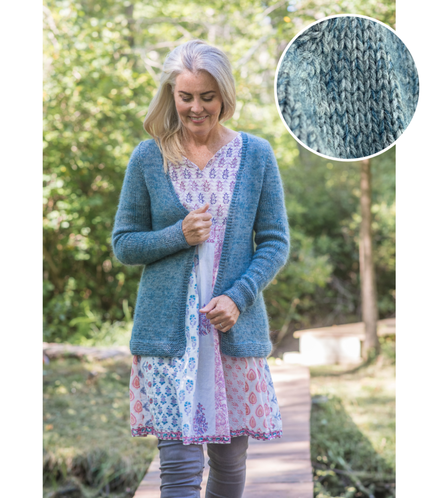 Our newest cardigan Ellsworth is simple and uncluttered. Using Aerial held together with Ultra Wool DK, gives this sweater a soft halo and extra softness.