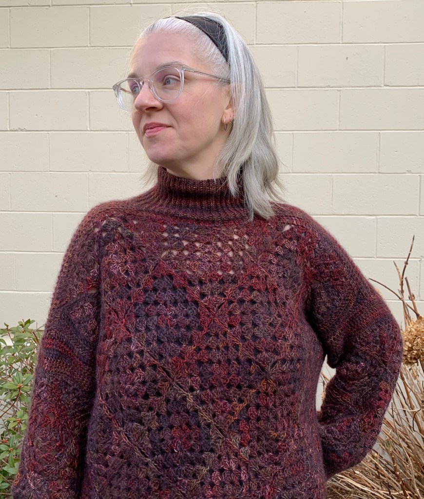 The Rena pullover was fun to make because you start by making about a bunch of 3-round granny squares and triangles (super portable if you’re making on the go), then join them together into panels for the back, front, and sleeves, making the last round of the granny square as part of the joining process. It’s very efficient! Just don’t forget to weave in the ends on your granny squares as you go… I definitely would not recommend leaving them all to the very end!