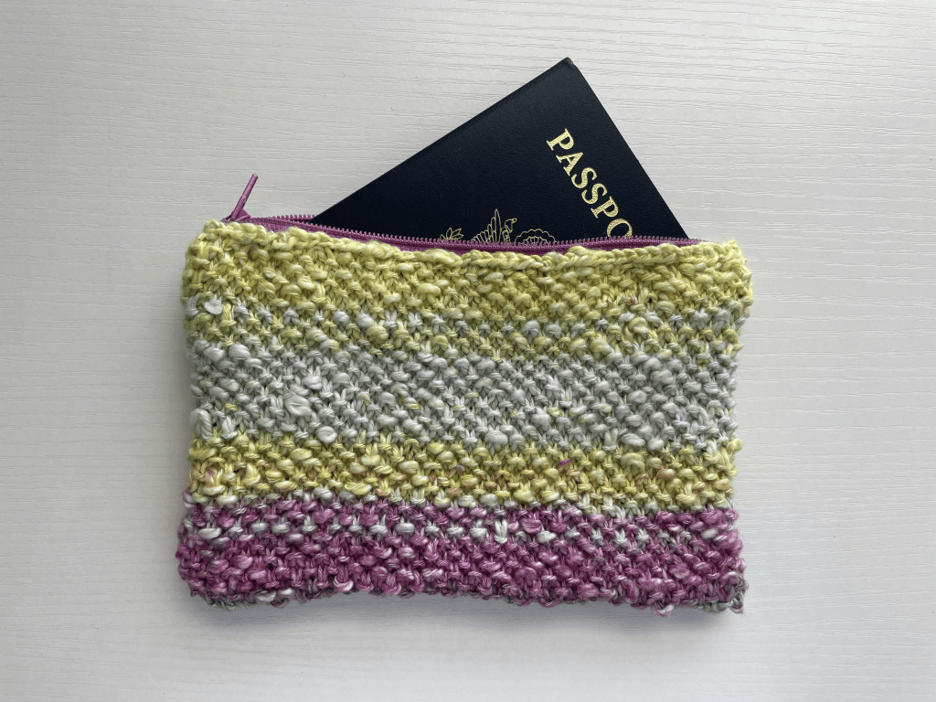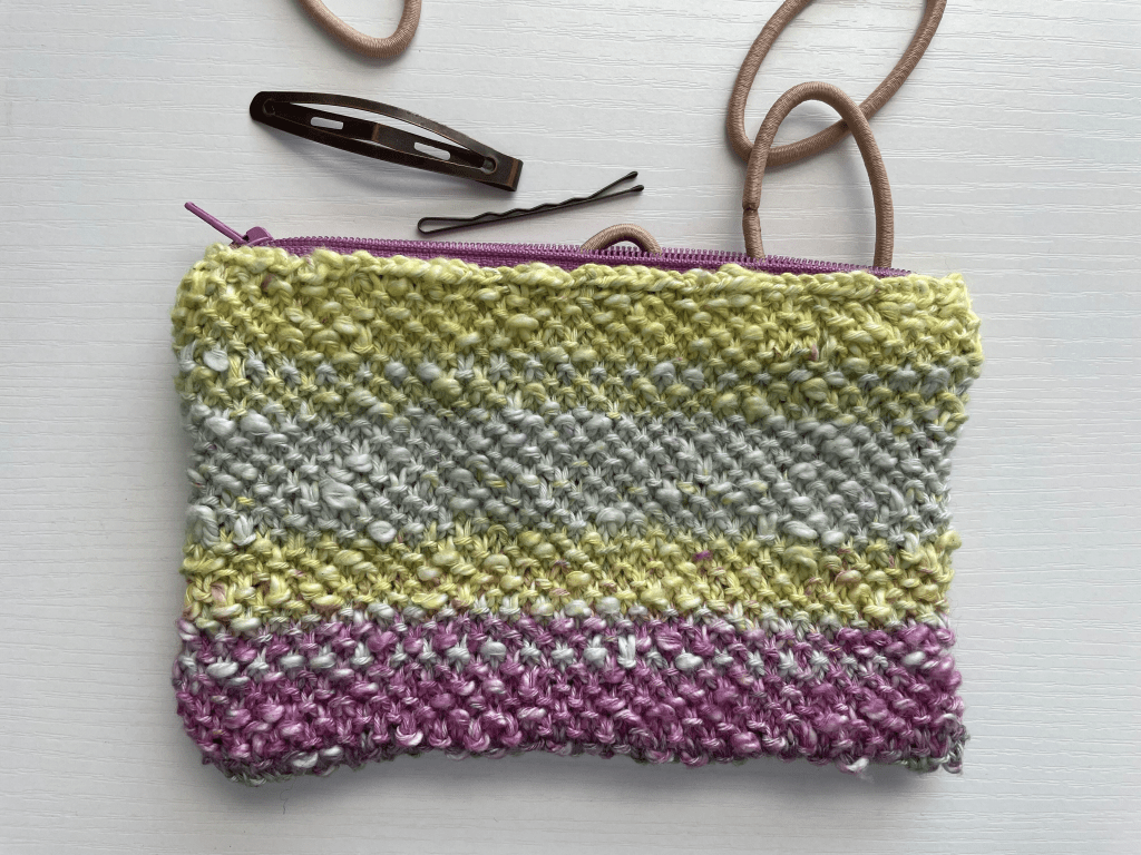 The bag itself is made up of a rectangle, seamed along two sides, with an opening along the top for the zipper. You will need a zipper the length of your pouch, matching and contrasting thread, a sharp sewing needle, pins and scissors. A medium weight all-purpose zipper works well for this project. If using a contrasting zipper like I did, you could match the thread to the yarn or the zipper.