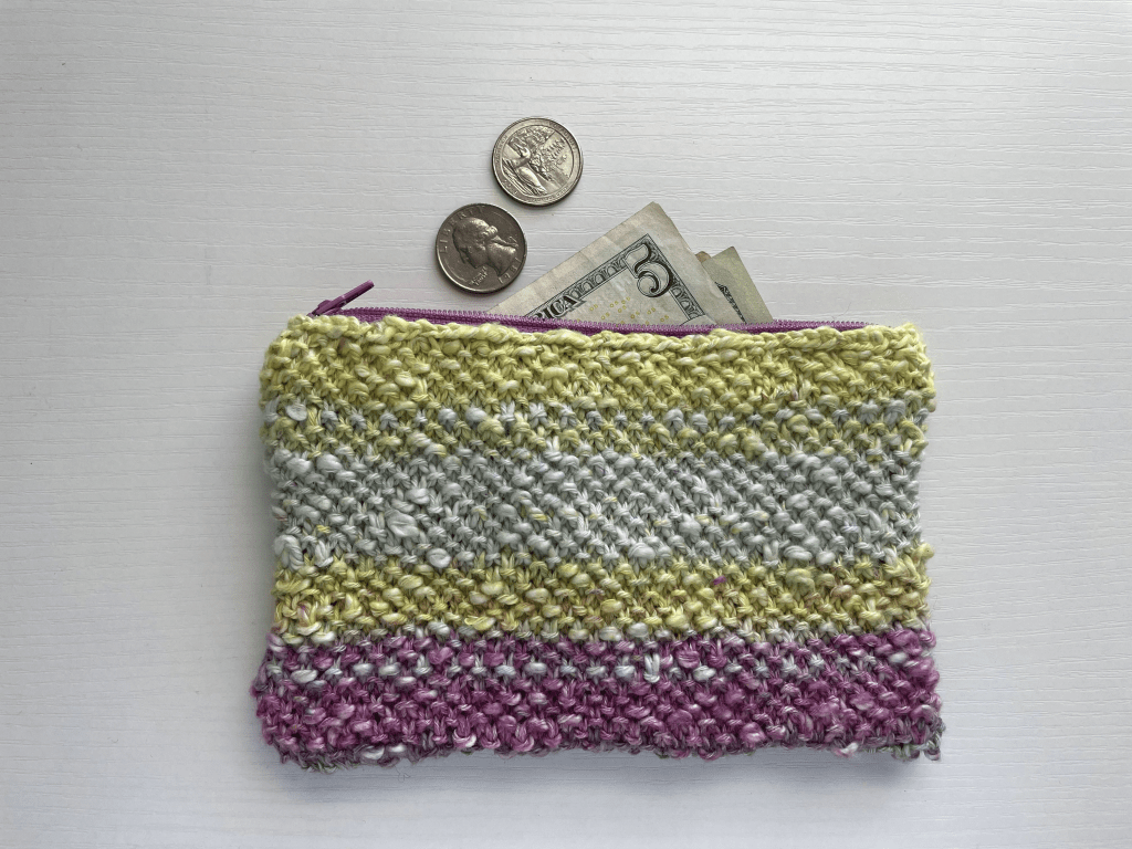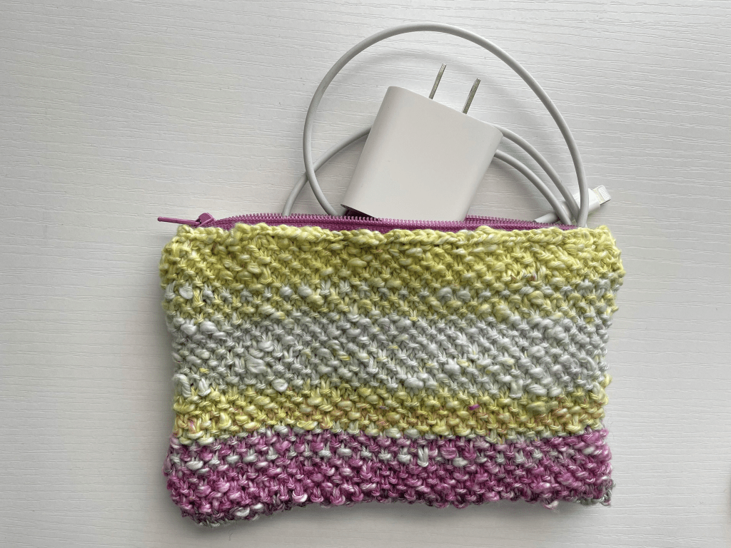 3. Use the matching thread and a back stitch to sew the edge of pouch onto zipper from the right side of the knitting. Sew just below the bind-off edge, and about ¼” away from the zipper teeth. I used a contrasting zipper, and I wanted that pop of color to show a bit. Again, try opening and closing the zipper to make sure the knitted edges won’t get caught. When you’re done with this seam, you can remove the basting stitch.