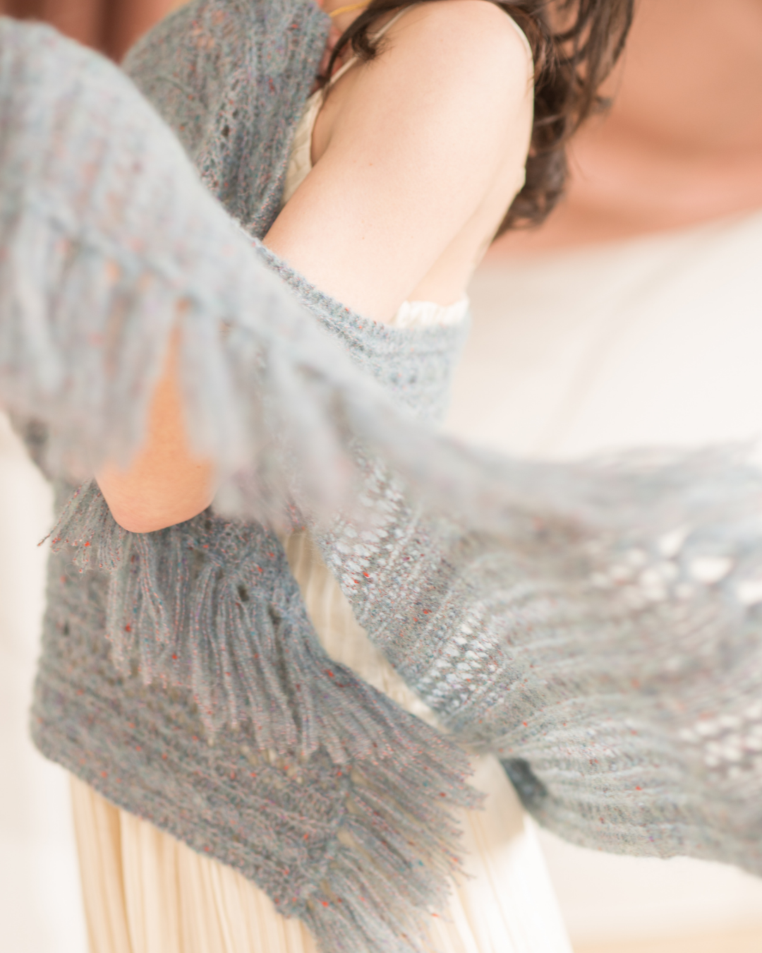 The texture of the yarn blurs the stitches of stockinette into a smooth fabric, that is very forgiving to uneven stitches, but we also love this yarn in a delicate lace stitch.
