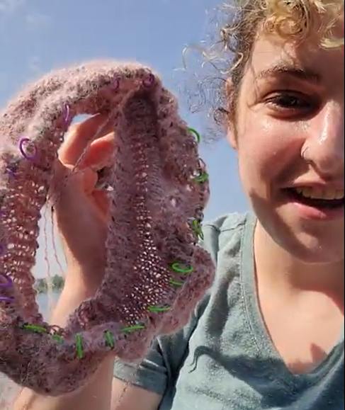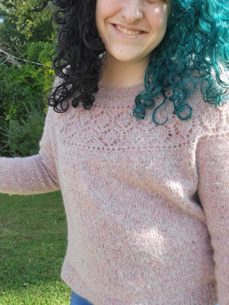 Because I was on vacation in the middle of nowhere, I didn’t have access to all of my knitting tools. When working on the lace pattern in the yoke, I kept losing my place. I wish I had brought a removable stitch marker to move as I knit, so I ended up using about 30 stitch markers that couldn’t be removed to keep track of my place. It wasn’t a very elegant solution, but it worked!