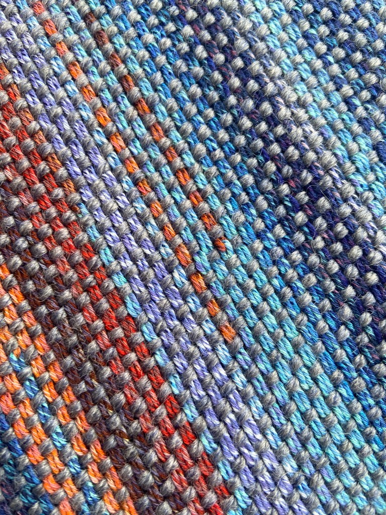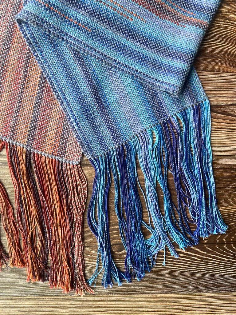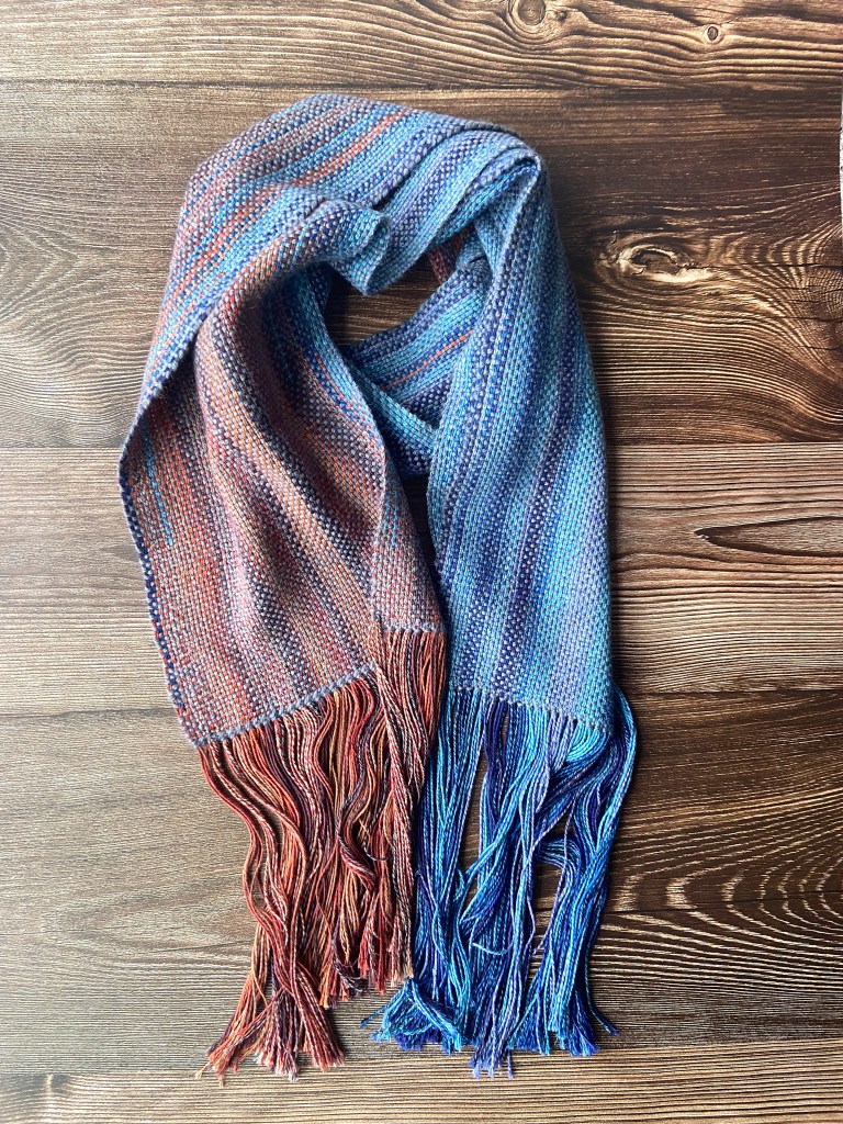 The warp uses two colors of Medina that are looped together in the middle which creates a unique look to each scarf. The only challenge, the warp! This process is best done with a friend, hence the name: Four Hands Scarf!