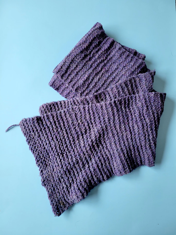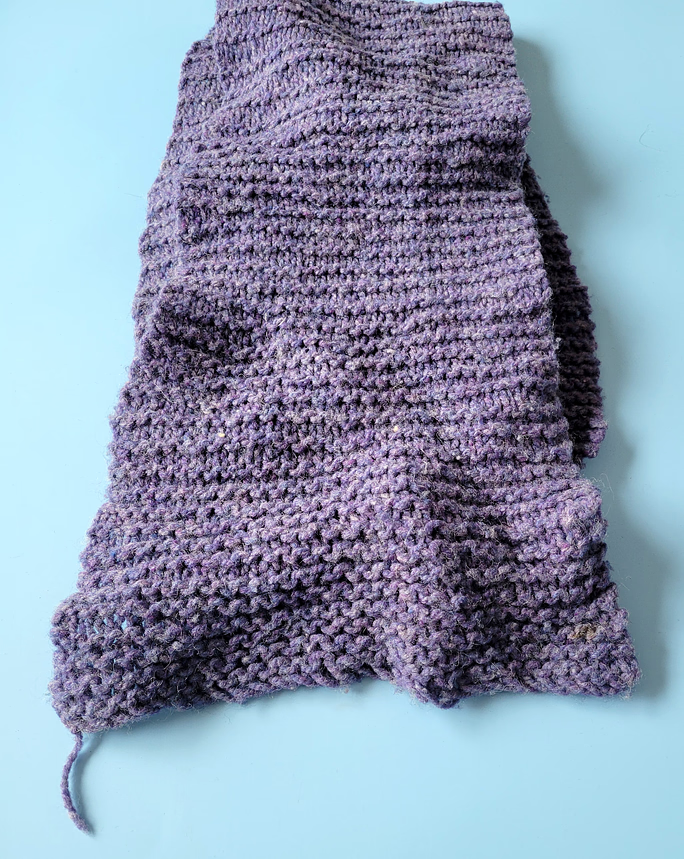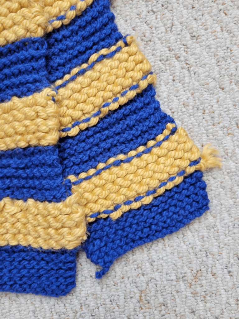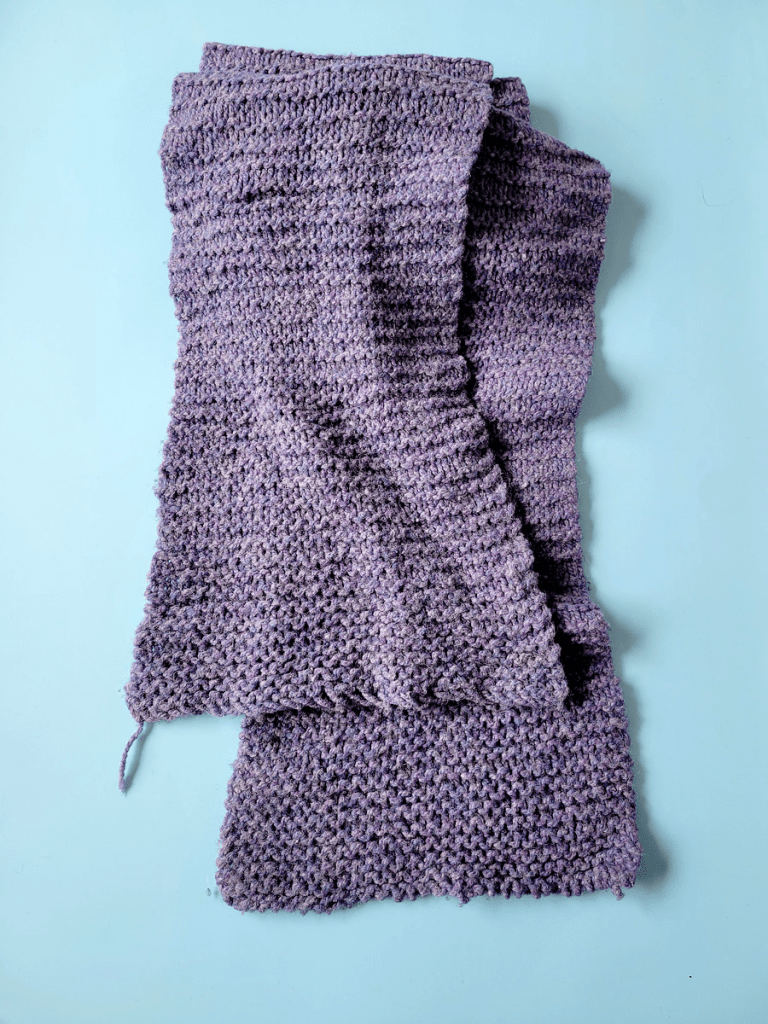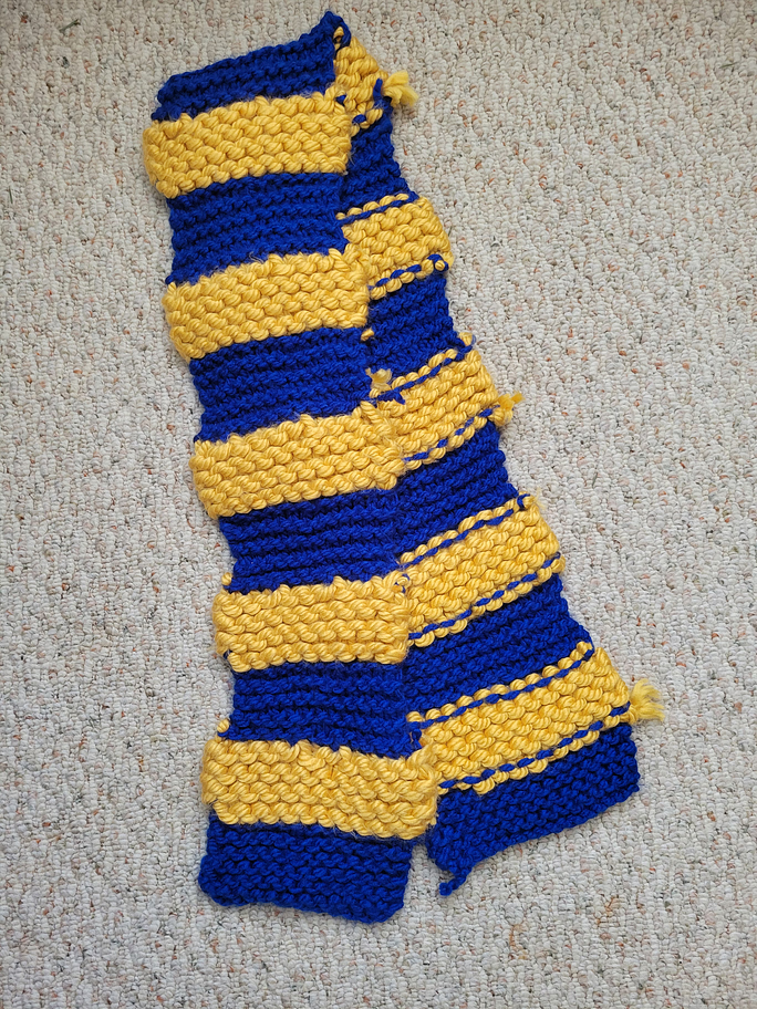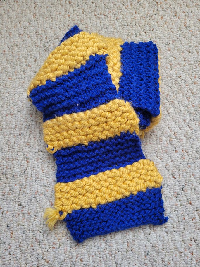 I made this scarf in middle school in preparation for starting high school. I had only ever made things in garter stitch, with one color, and this was my first attempt at stripes. I had no idea how to weave in ends, and used two very different yarns because they were the only ones I had in my high school colors. My mom actually still wears this scarf because she works at the high school.