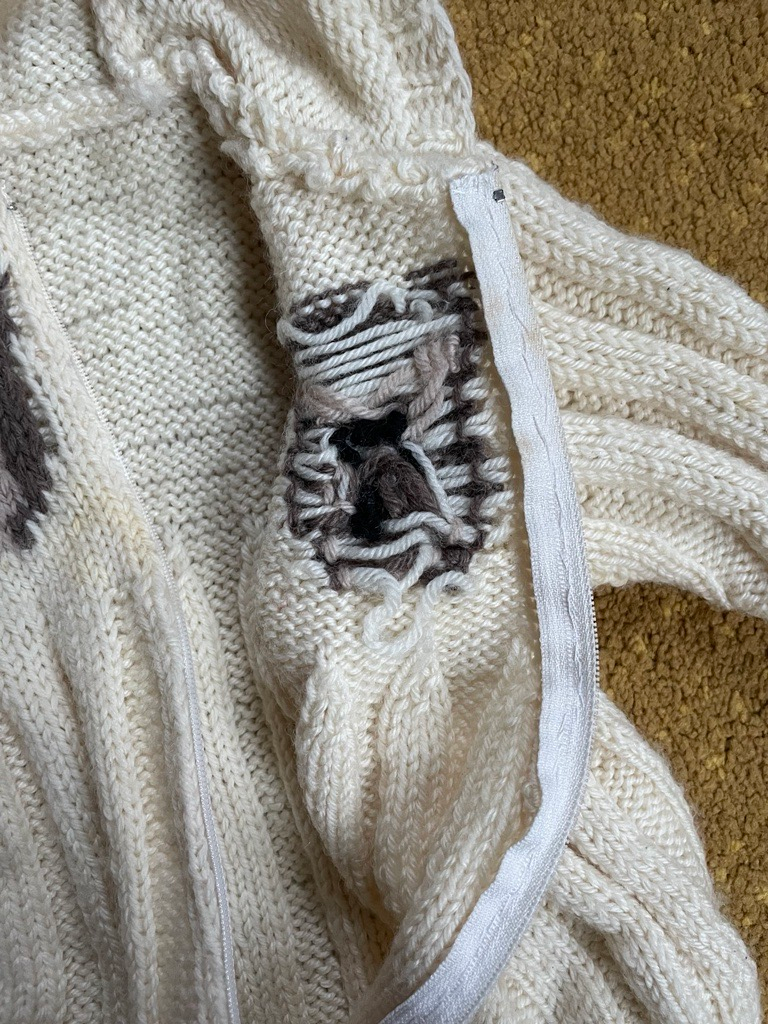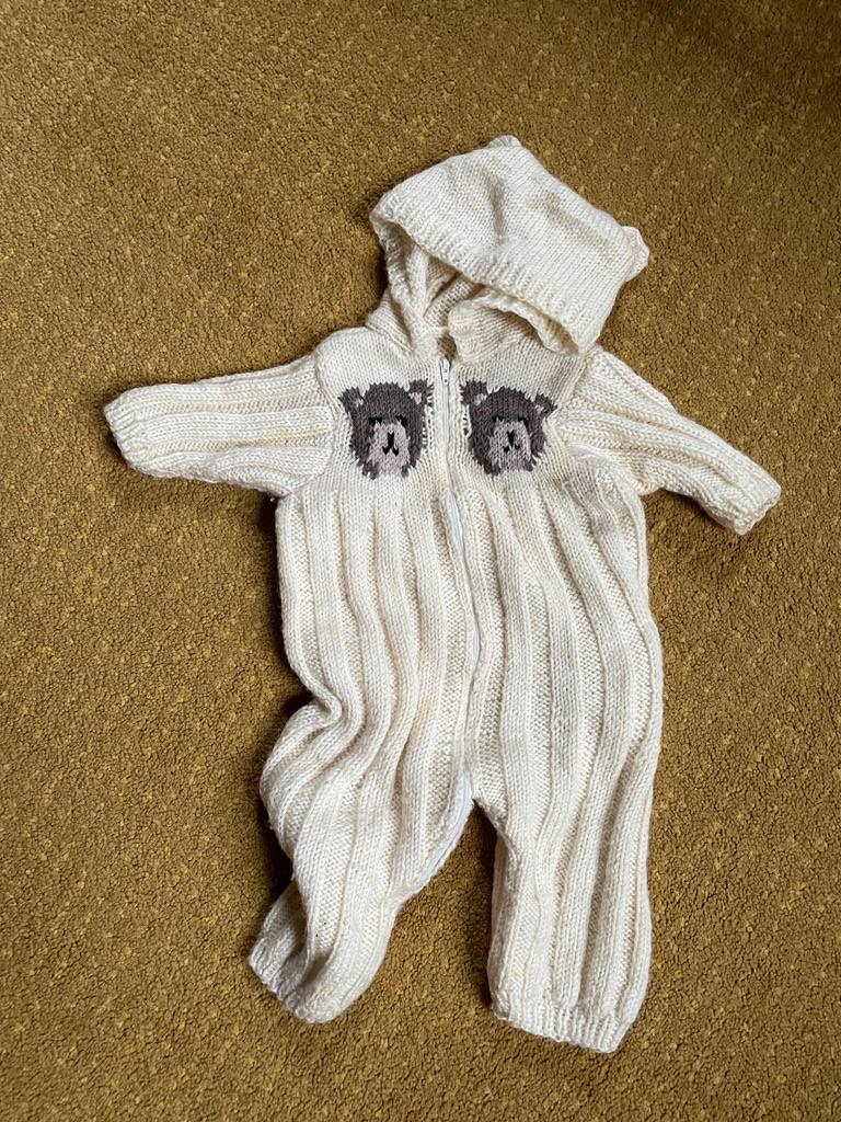 This was not my first knitting project, but it was definitely a time I jumped in the deep end! I was expecting my first baby and picked up this kit in a yarn store. I had never done any colorwork before, did not know what blocking was and had never sewn in a zipper. This was before the time of easy access to video tutorials, but I remember thinking “how hard can it be?” Well, it was a hard project! I had a book with photo instructions for the zipper, and that part turned out pretty good, but I had no idea how to do the colorwork teddy bears. They came out buckled and full of gaps. I remember how frustrated I was at the time. But in the end both the overall and blanket got a lot of use and I am so glad I still have them!
