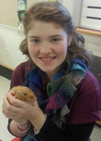 My first finished project was the Potato Chip Scarf (YUM) I made it in about a week because I got so excited every time the color changed! Ravelry: Potato Chip Scarf pattern by Barbara Aguiar (this is the only photo I have of it lol and yes that is a class hamster)