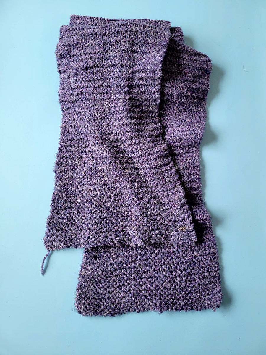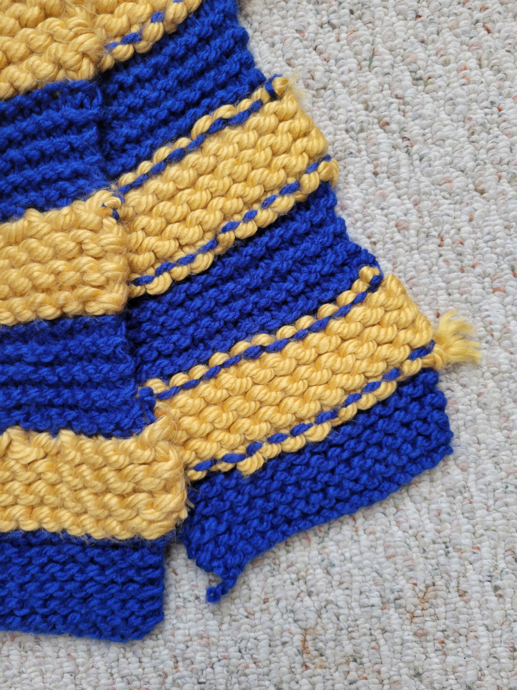I made this scarf in middle school in preparation for starting high school. I had only ever made things in garter stitch, with one color, and this was my first attempt at stripes. I had no idea how to weave in ends, and used two very different yarns because they were the only ones I had in my high school colors. My mom actually still wears this scarf because she works at the high school.