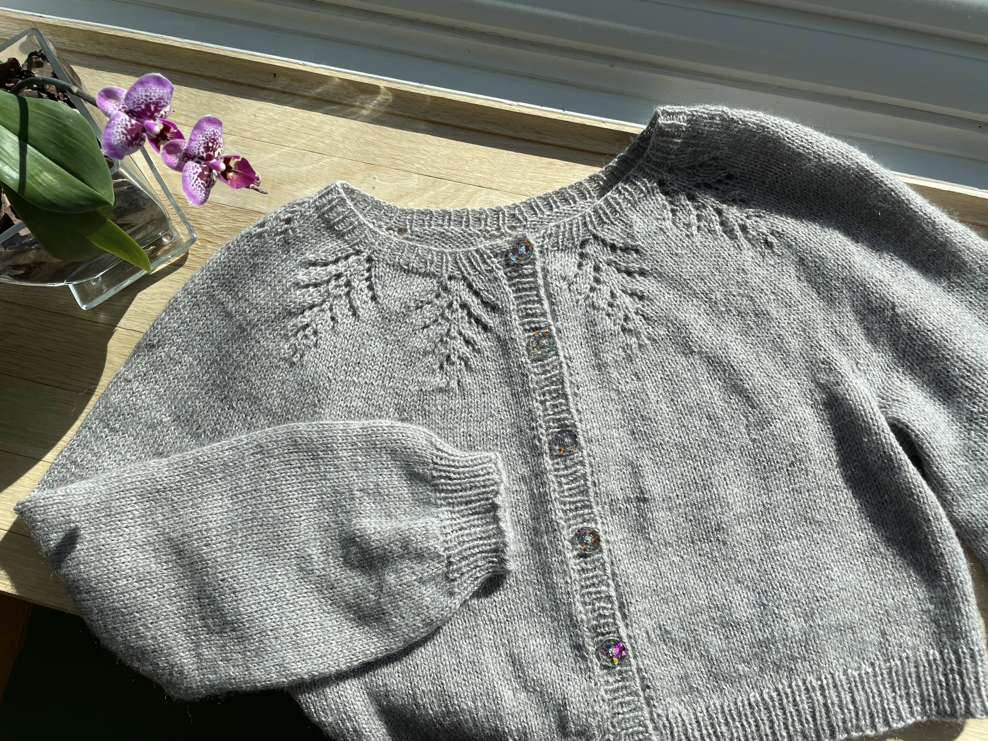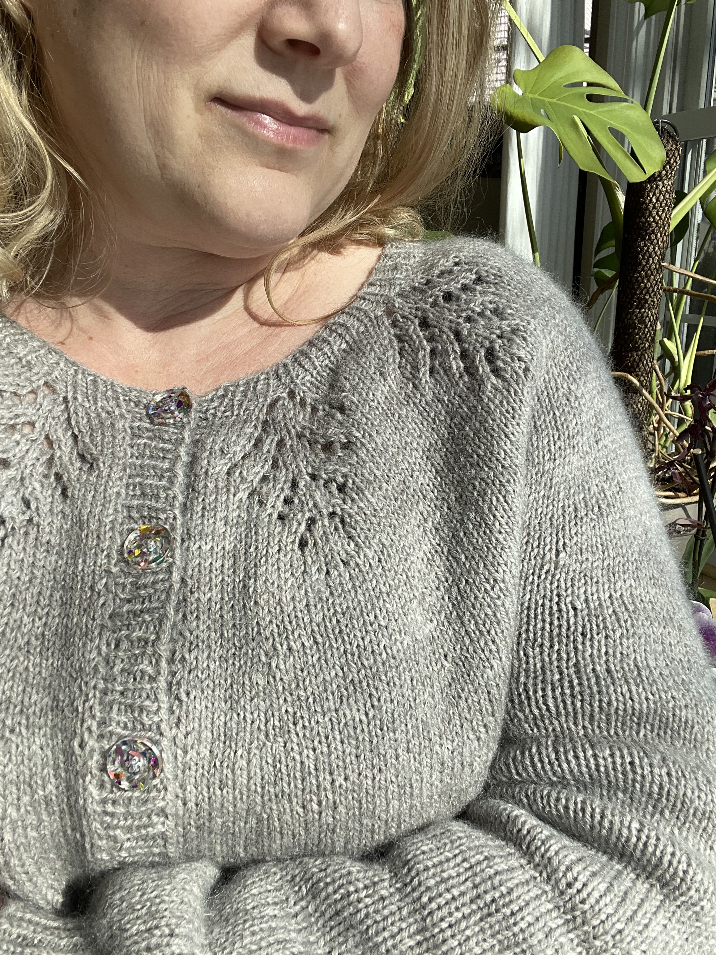 Now for the buttons: The acrylic confetti buttons are from Katrinkles. I love how the colorful sparkle contrasts with this otherwise neutral cardigan. These exact buttons were a special edition and are no longer available, but keep an eye out, Katrinkles often come up with fun new things!