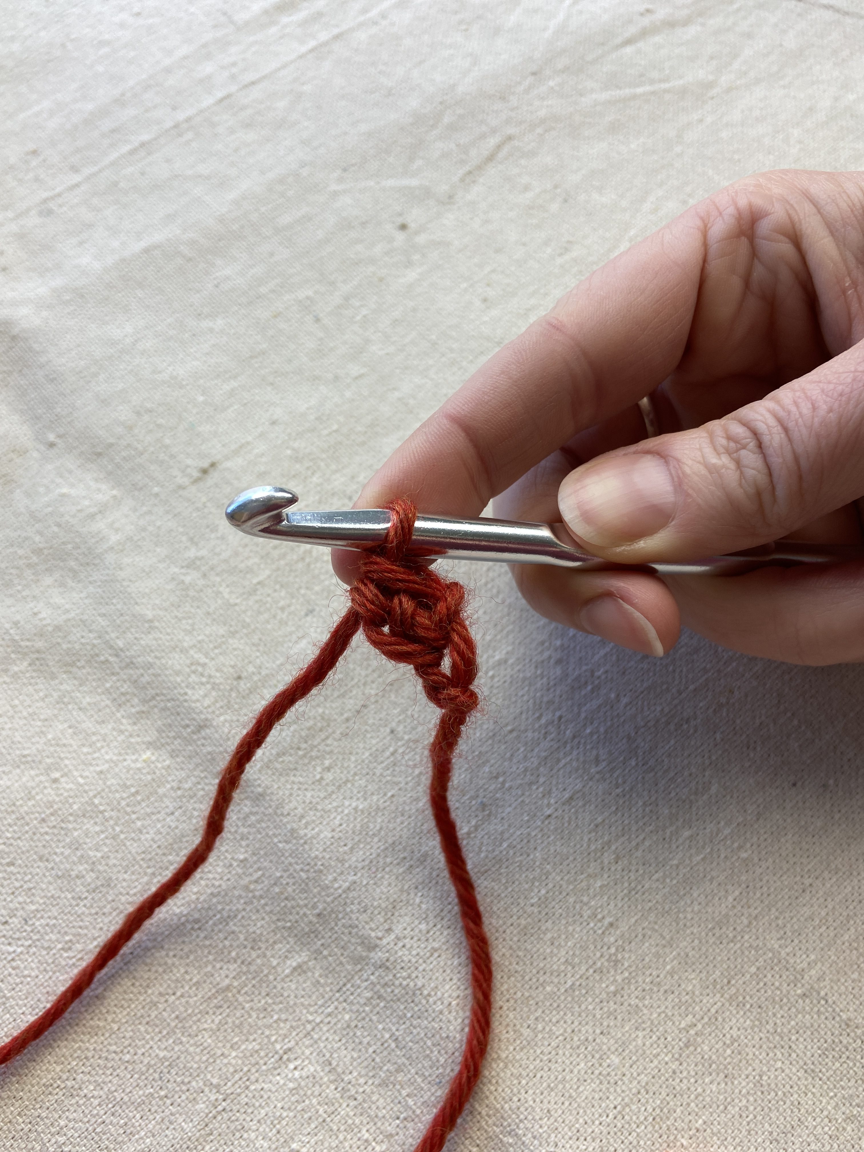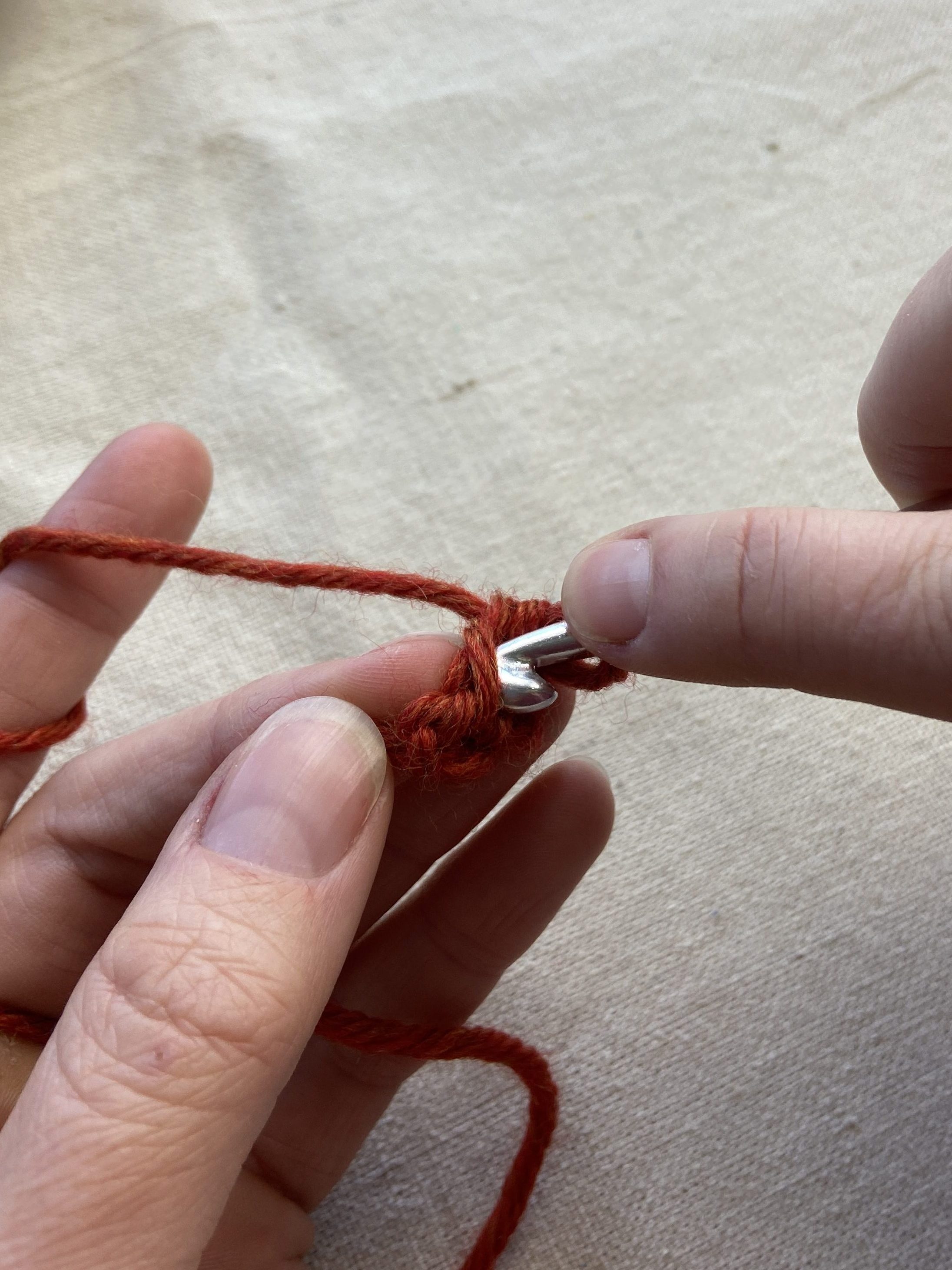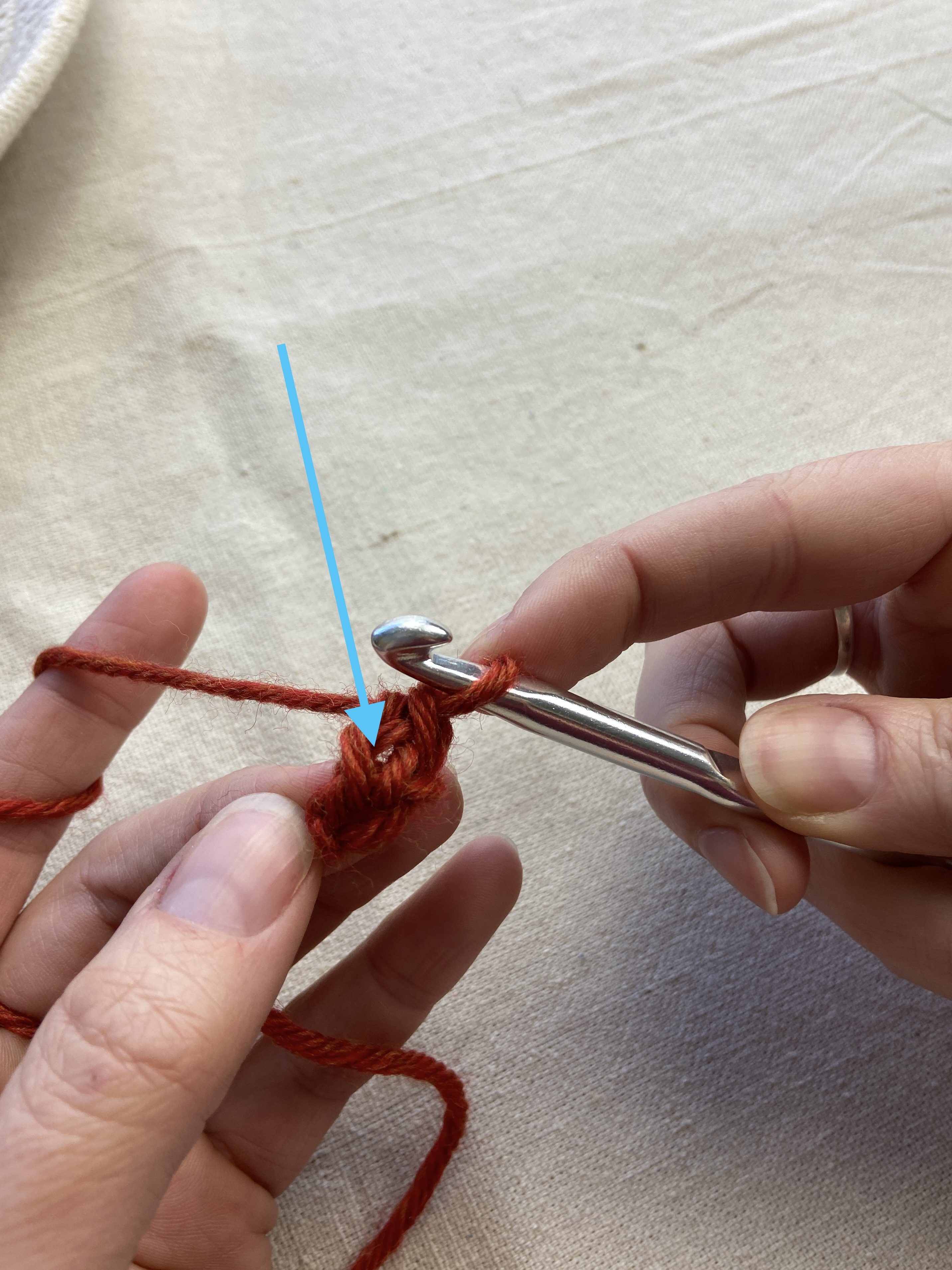 Step 5: Insert hook into both legs of the “chain” stitch and draw up a loop.