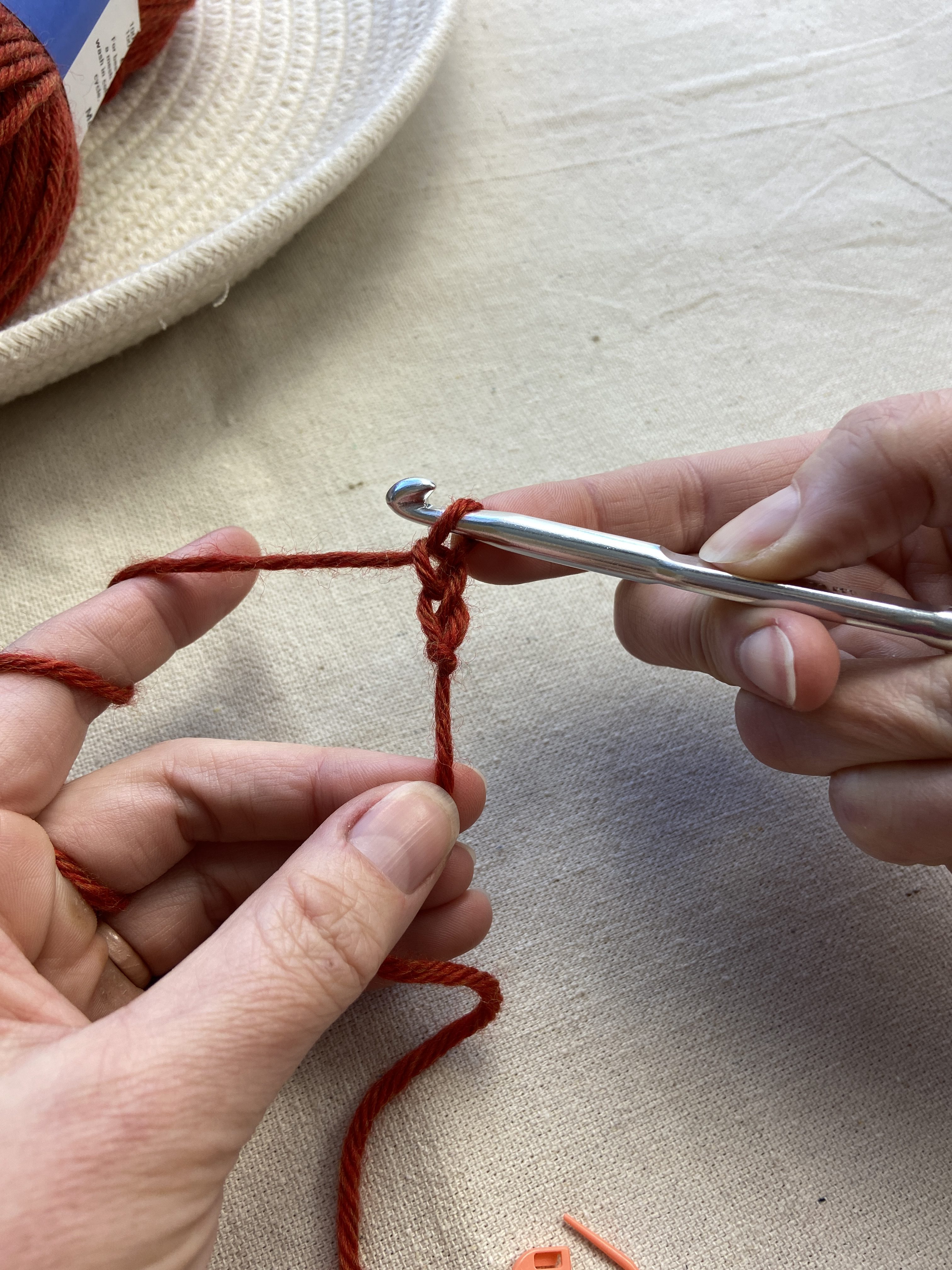 Step 4: Yo and draw through both loops. First Foundation sc made.